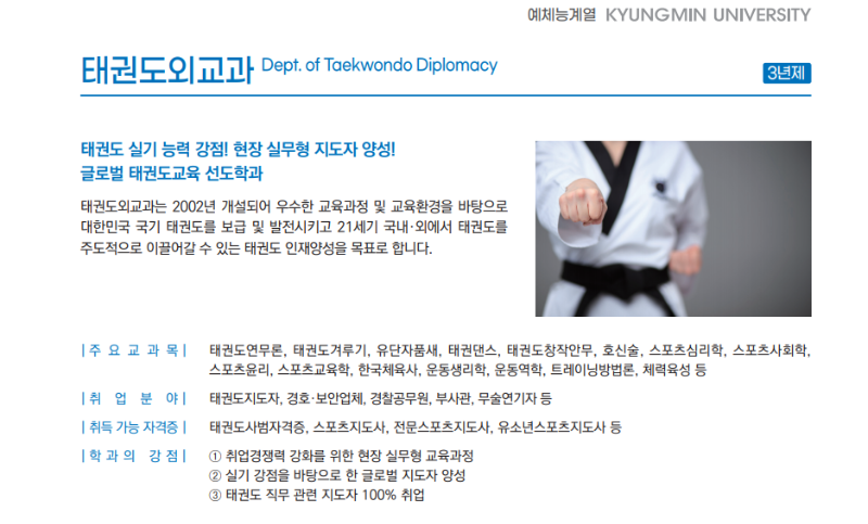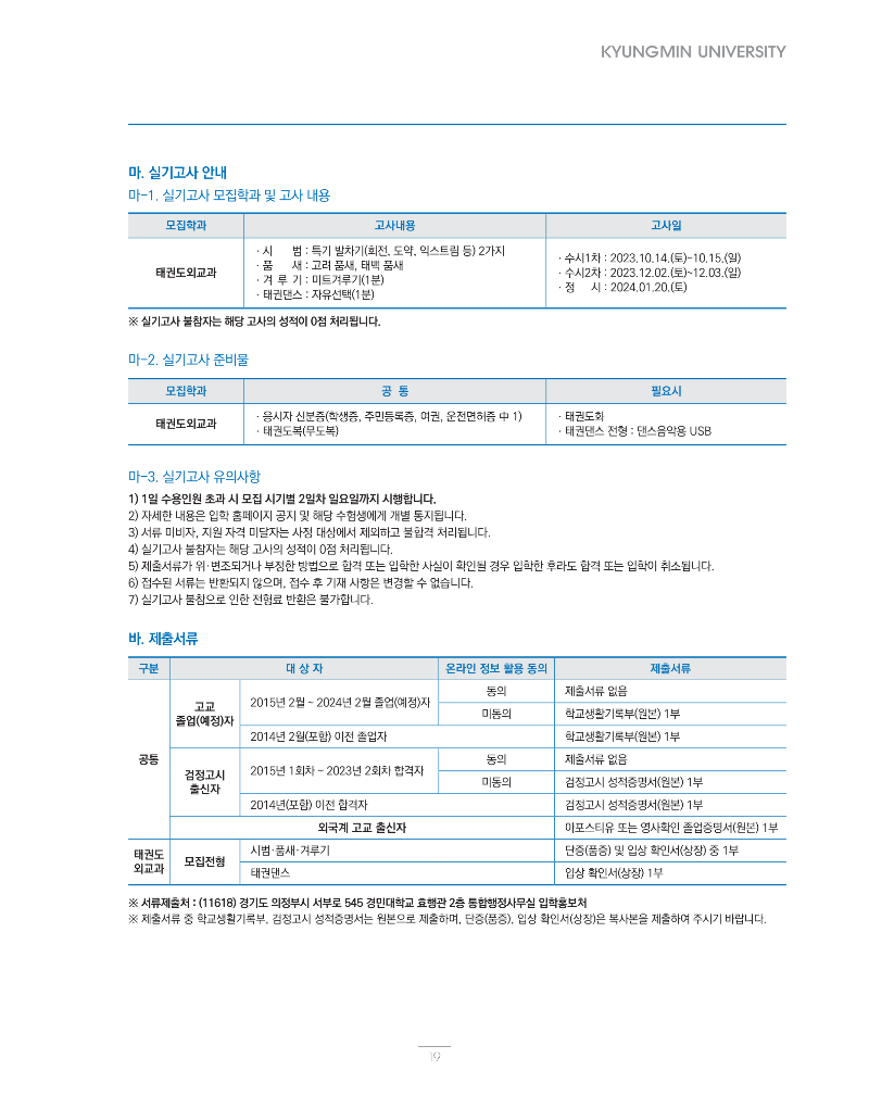태권도 입시 2024년 경민대학교 태권도외교과 모집요강 by 이싸부 2023. 9. 29. 728x90 수시 1차 - 23.9.11.월요일 ~ 10.5.목요일 24:00까지 수시 2차 - 23.11.10.금요일 ~ 11.24.금요일 24:00까지 정시 모집 - 24.01.03.수요일 ~ 01.15.월요일 24:00까지 수시 1차 - 58명 수시 2차 - 31명 정시 - 3명 경민대학교_모집요강.pdf 12.20MB 홈페이지<<바로가기 728x90 공유하기 게시글 관리 이사부 블로그